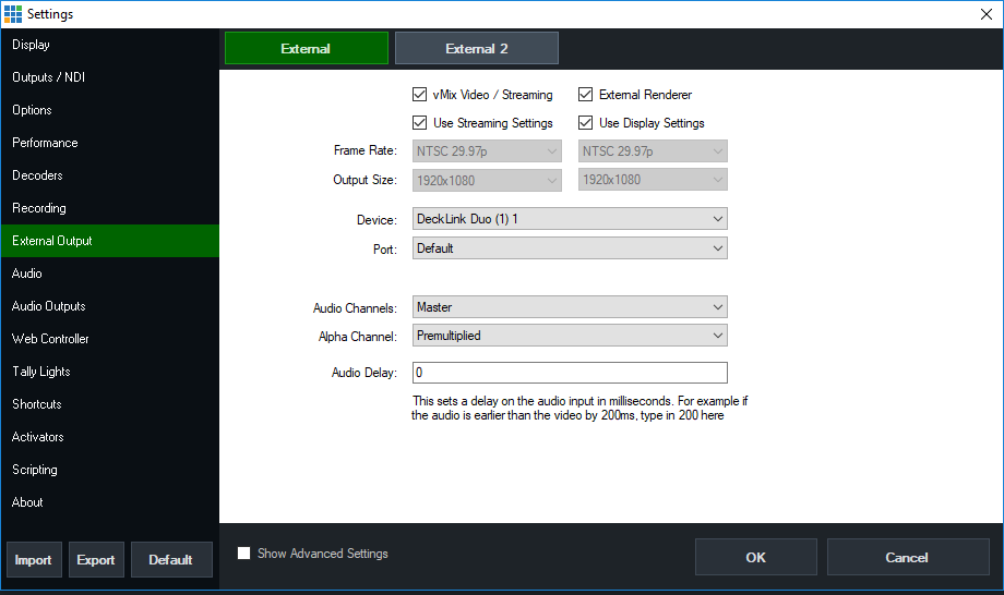 When selecting a supported device in External Output settings in vMix, an Alpha Channel dropdown box will appear as shown below: